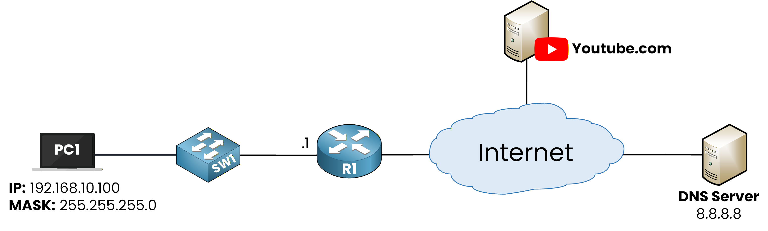 In this lab, you will configure DNS settings on a small network to allow local hosts to access internet services (such as YouTube) using domain names instead of IP addresses.