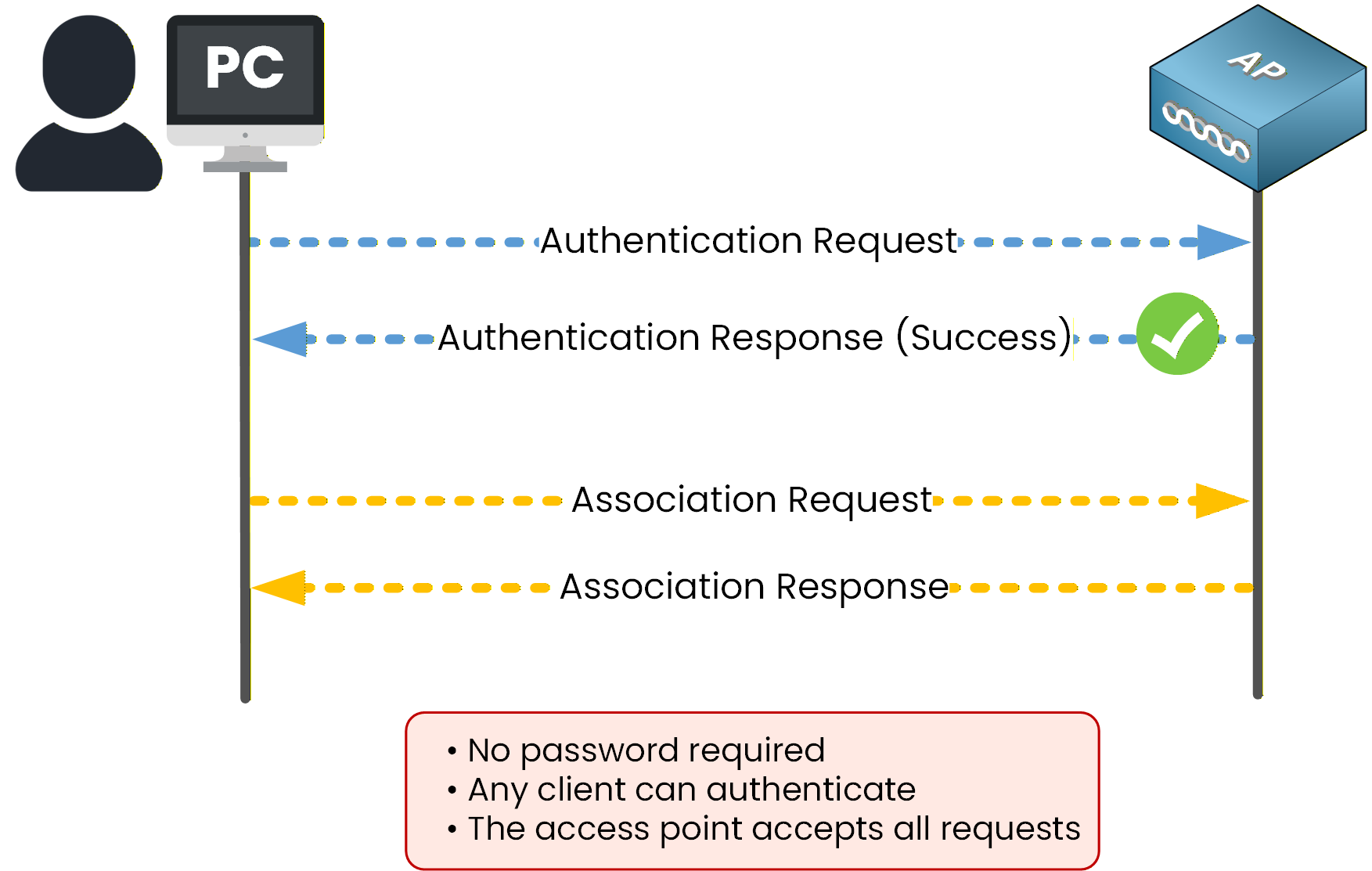 It provides no built-in security.As shown in Figure 2, the client sends an authentication request to the access point, and the access point accepts all authentication requests without verifying any credentials.