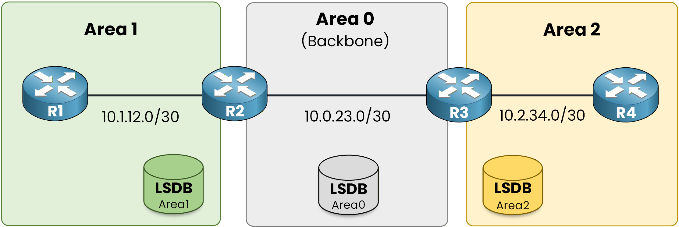 Area 0 connects everything together, while Areas 1 and 2 contain their own internal networks.