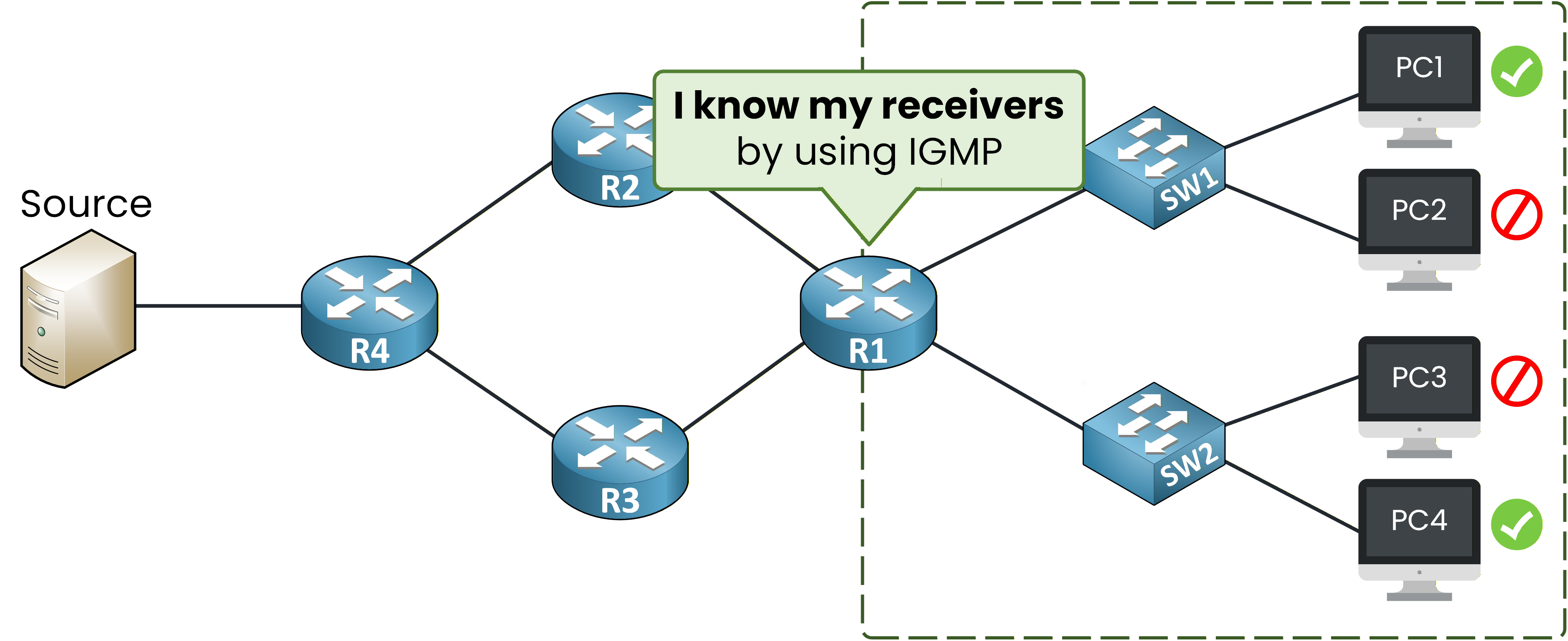 This is an opt-in model. By default, multicast traffic flows nowhere.This raises a new question. When a receiver joins a group, its last-hop router needs to request the stream.