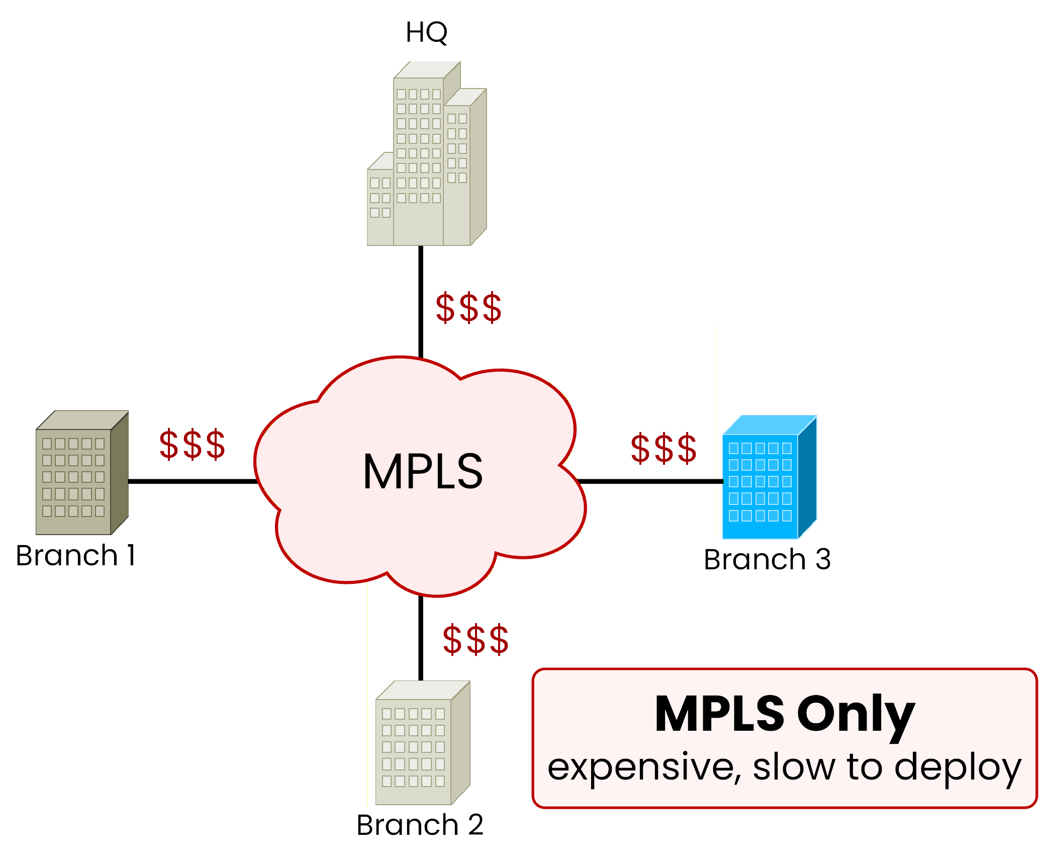 Every site needs its own MPLS circuit. Adding a new branch means ordering a new line from the provider, which can take weeks or months.